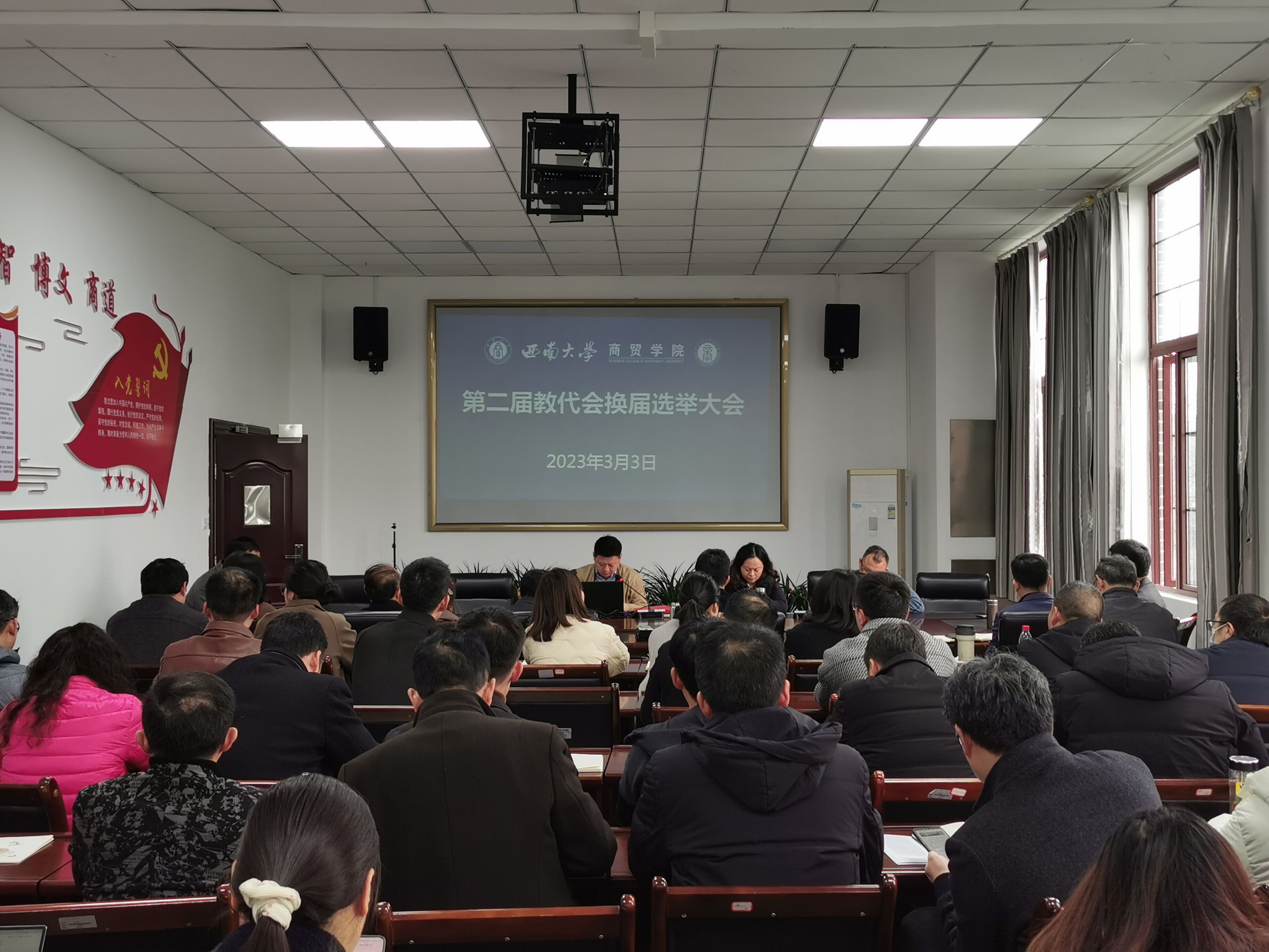 3月3日,必赢优惠y272net举行工会教代会换届选举大会,学院党政领导及全体教职工参加了本次会议。换届选举工作由学院党委书记王熹主持。