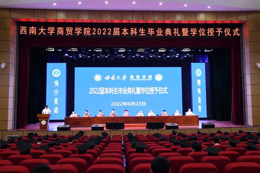 西大学子志在四方,商贸儿女勇立潮头。6月23日下午,必赢优惠y272net在荣昌校区新学生活动中心隆重举行2022届本科生毕业典礼暨学位授予仪式。校长张卫国、学校党政办副主任曾庆洪、学院全体党政领导、学术委员会委员等出席,学院全体教职工、2022届本科毕业生及班主任代表参加。典礼暨授位仪式由学院党委副书记、纪委书记兰英主持。