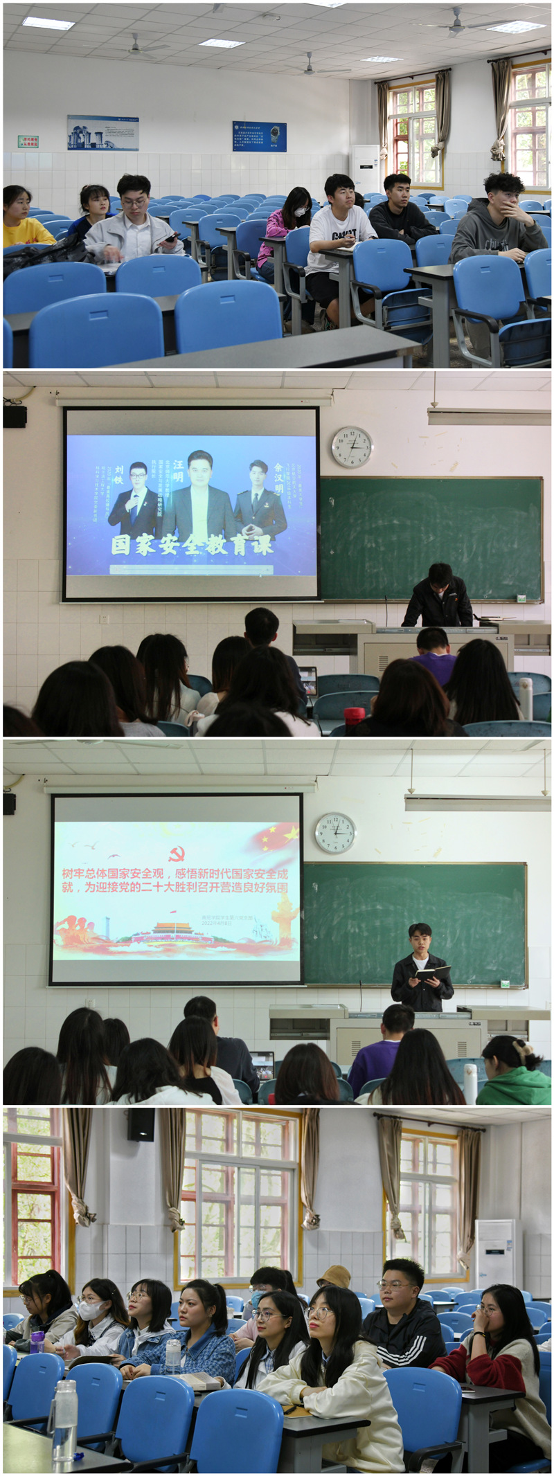 4月8日下午,学院教工、学生党支部分别以“党旗在疫情一线高高飘扬”和“树牢总体国家安全观,感悟新时代国家安全成就,为迎接党的二十大胜利召开营造良好氛围”为主题开展4月主题党日活动。参加此次活动的有各支部党员、发展对象和部分入党积极分子。