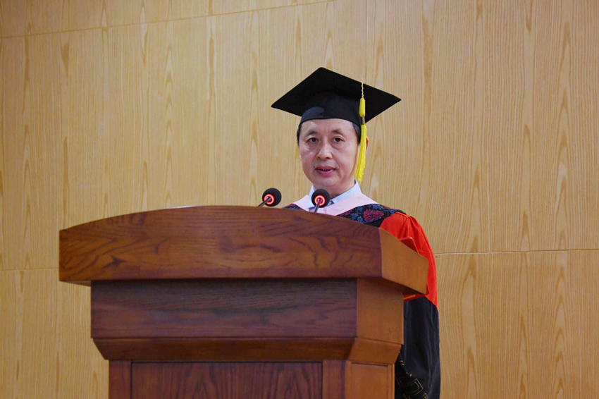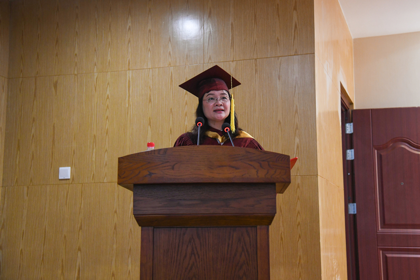 随后,学院院长李晓阳为全体毕业生寄语,通过中英双语表达了对毕业生的祝贺和期许。她向顺利完成学业的同学们送上诚挚祝福,向潜心育人的学院教职工致以崇高敬意,向关心关爱同学们成长成才的亲朋好友表达衷心感谢。李院长从事业结构、学科建设、人才培养、平台建设、国际化办学等方面介绍了必赢优惠y272net的发展成绩和美好愿景。她鼓励毕业生们要心怀感恩、心存壮志、树立榜样,嘱托同学们在未来的日子里,不管走得多远,飞得多高,带上家人常回必赢优惠y272net看看,学院永远是同学们的家。