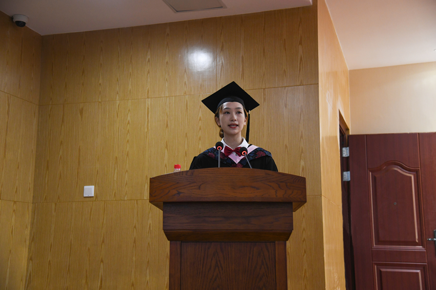2021届本科毕业生沙昕田同学作为代表发言。她在发言中回顾了四年的校园学习和生活,衷心地表达了对学院领导老师的敬意,对父母家人的感谢,对朋友同学的祝福。她以自己的奋斗经历与同学们共勉,期待同学们在今后的岁月里树立鸿鹄之志,用奋斗书写青春。