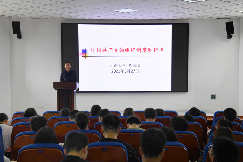 5月27日,荣昌校区党工委书记熊海灵在9601报告厅为学院第七期入党积极分子培训班学员讲授“中国共产党的组织制度和纪律”专题党课。