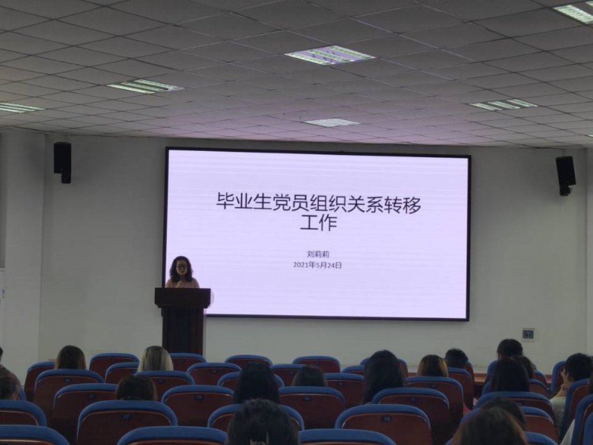 会上,刘莉莉老师就2021届毕业生党员教育工作安排作了介绍,并针对毕业生党员组织关系转接工作进行了专题培训。她强调,毕业生党员应时刻谨记党员身份,积极参加毕业生党员教育系列活动,包括专题党课、建言献策活动、给学弟学妹寄语活动、经验交流活动等,增强党员意识、提高党性修养,继续发挥党员模范带头作用。