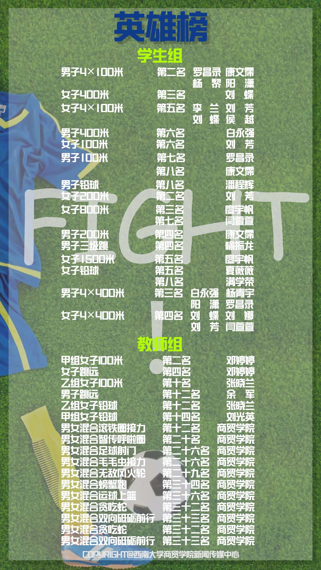 学生组方面,20市营5班刘芳在女子200米中斩获亚军;20信管2班廖宇帆获得女子800米季军;18市营3班刘蝶获得女子400米季军。在学生组集体项目中,商贸健儿团结奋进,勇攀高峰,斩获男子4×100接力赛亚军、4×400接力赛季军,女子4×400接力赛第四名,强身健体“体育运动健康达人”挑战赛团体一等奖。