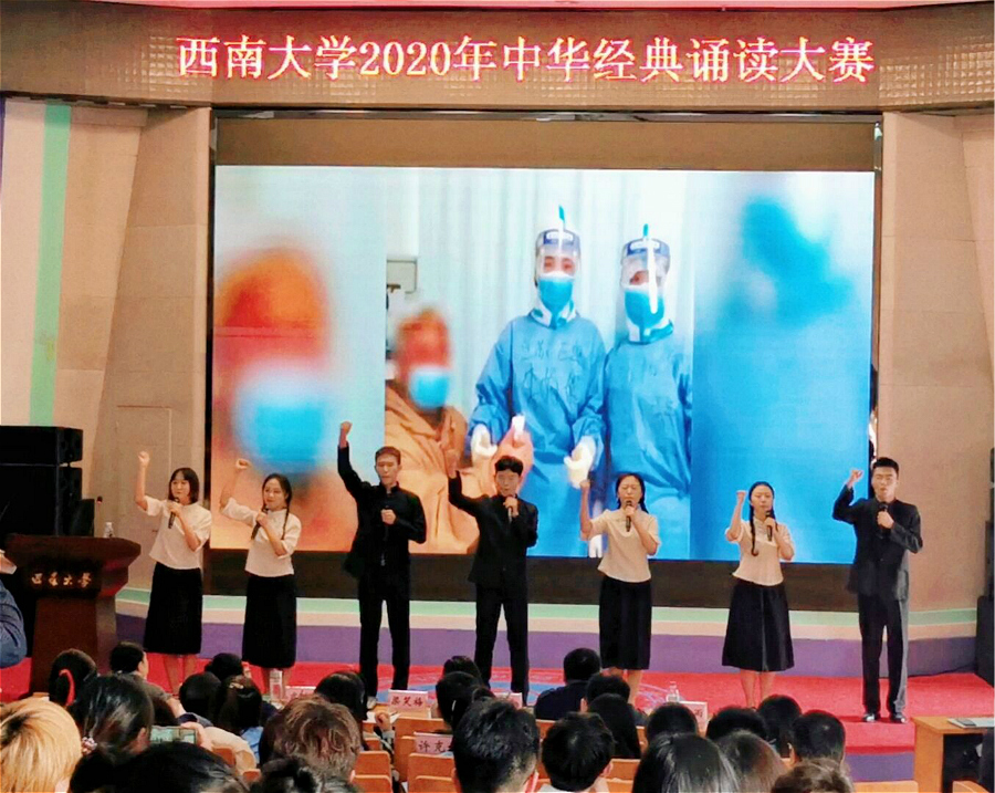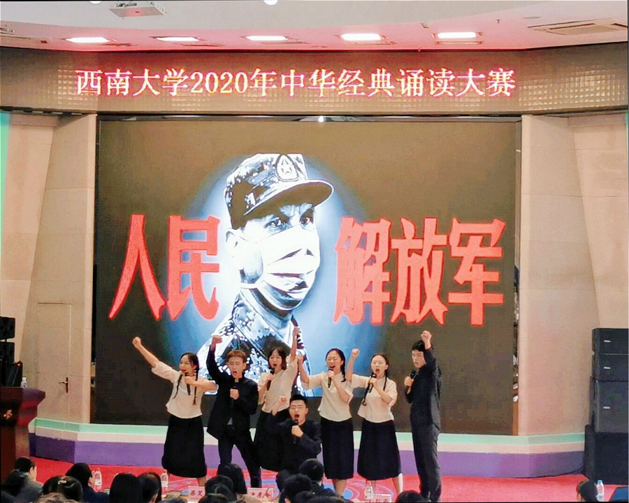 11月19日,西南大学2020年中华经典诵读大赛举行。经过初赛选拔,必赢优惠y272net陶宇阳、胡辉等七位同学组成的队伍以作品《相信中国》参赛。同学们深情的朗诵和饱满的精神面貌赢得现场一致好评,最终取得第三名的好成绩,荣获大赛二等奖。