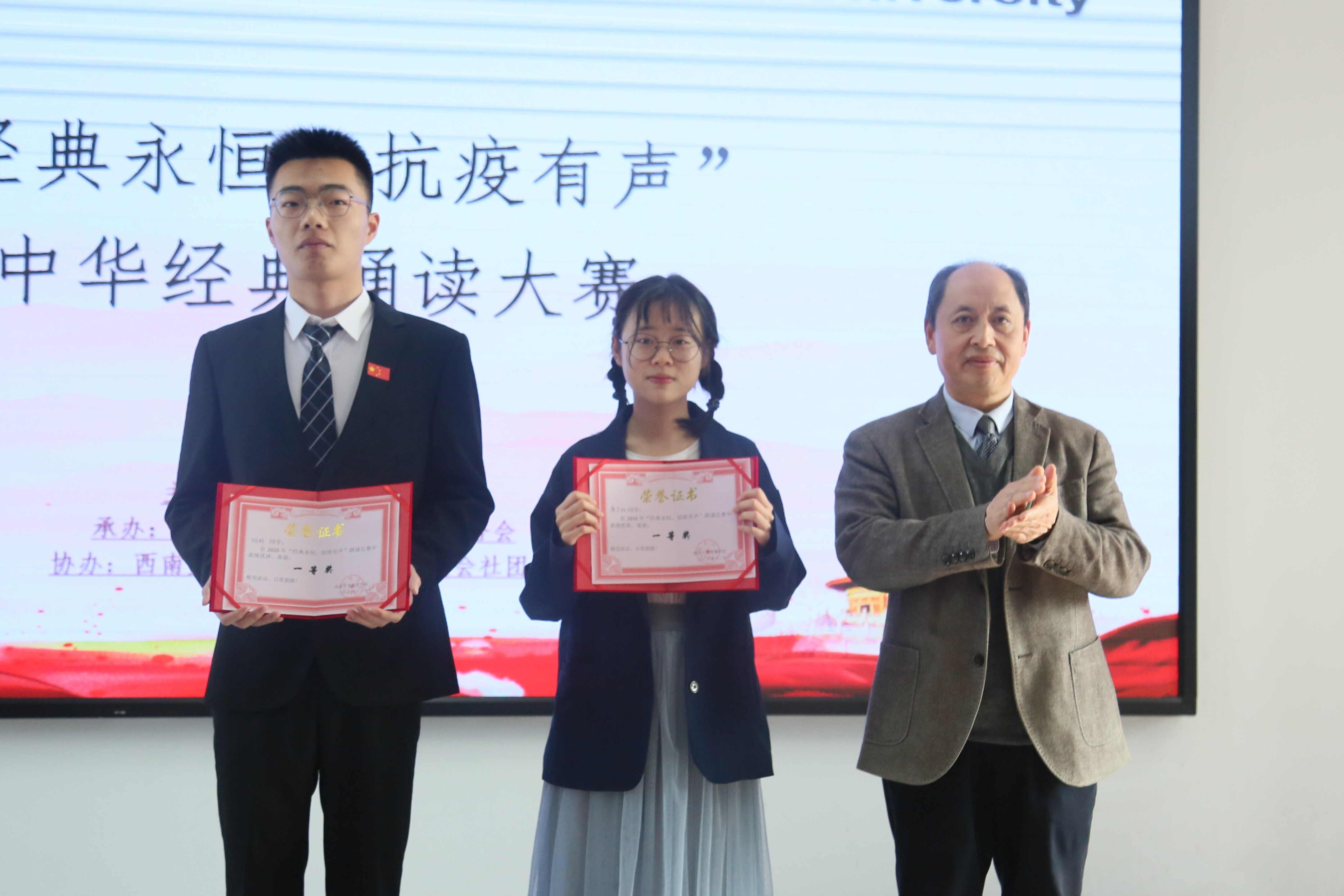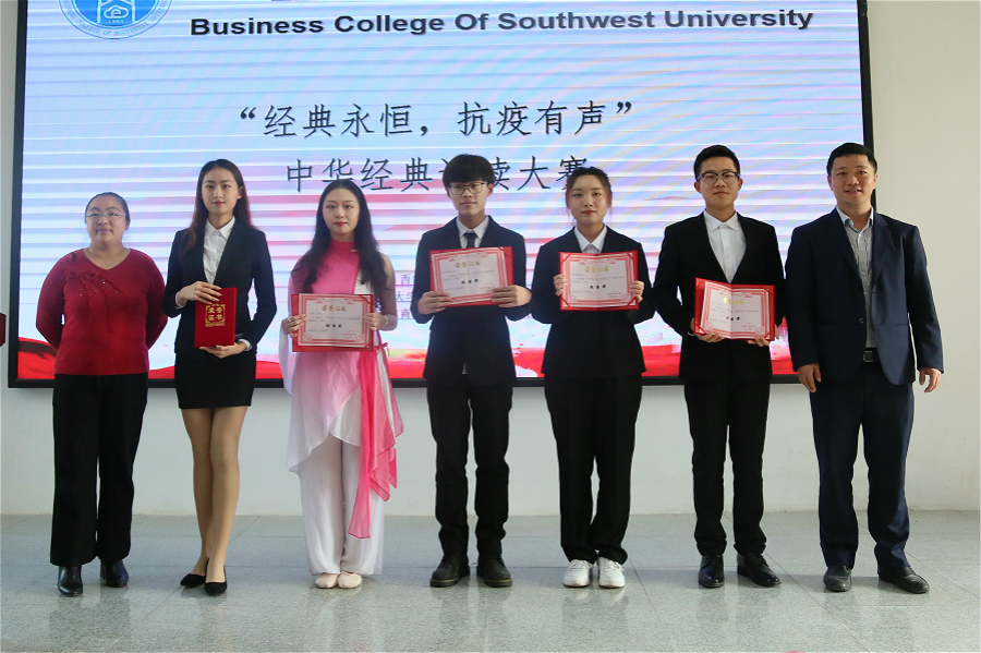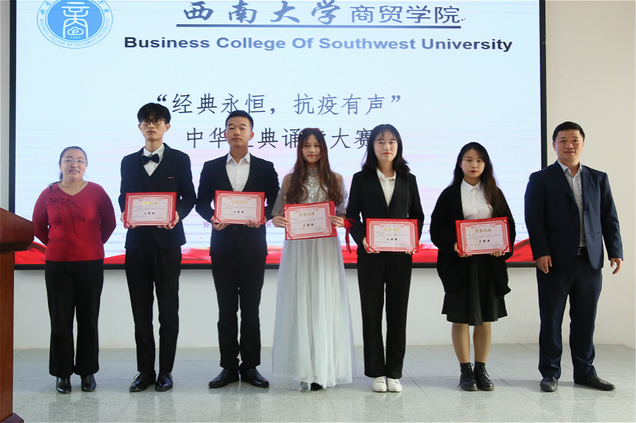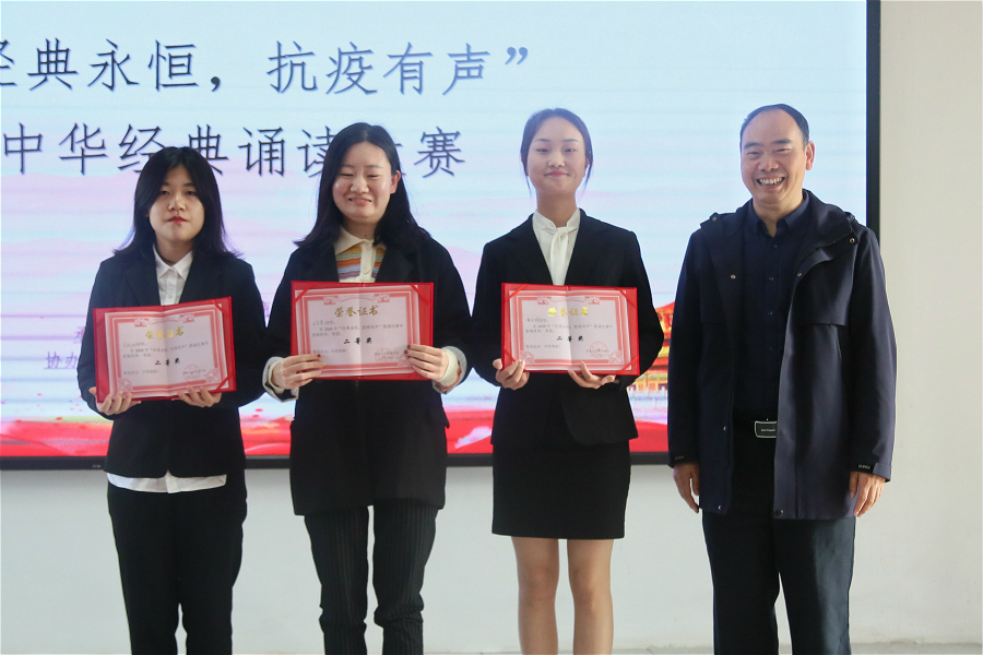 为传承优秀传统文化,丰富学生校园文化生活,用经典诗文弘扬伟大抗疫精神,向祖国告白,向英雄致敬,提高全体师生人文素养,2020年11月15日上午,必赢优惠y272net隆重举办以“经典永恒,抗疫有声”为主题的中华经典诵读比赛。学院党委书记周国安,副院长胡继宽,团委书记廖鹏,教学工作办公室主任刘光英,教学秘书余军出席了本次比赛,学院各专业学生到现场观摩了大赛。