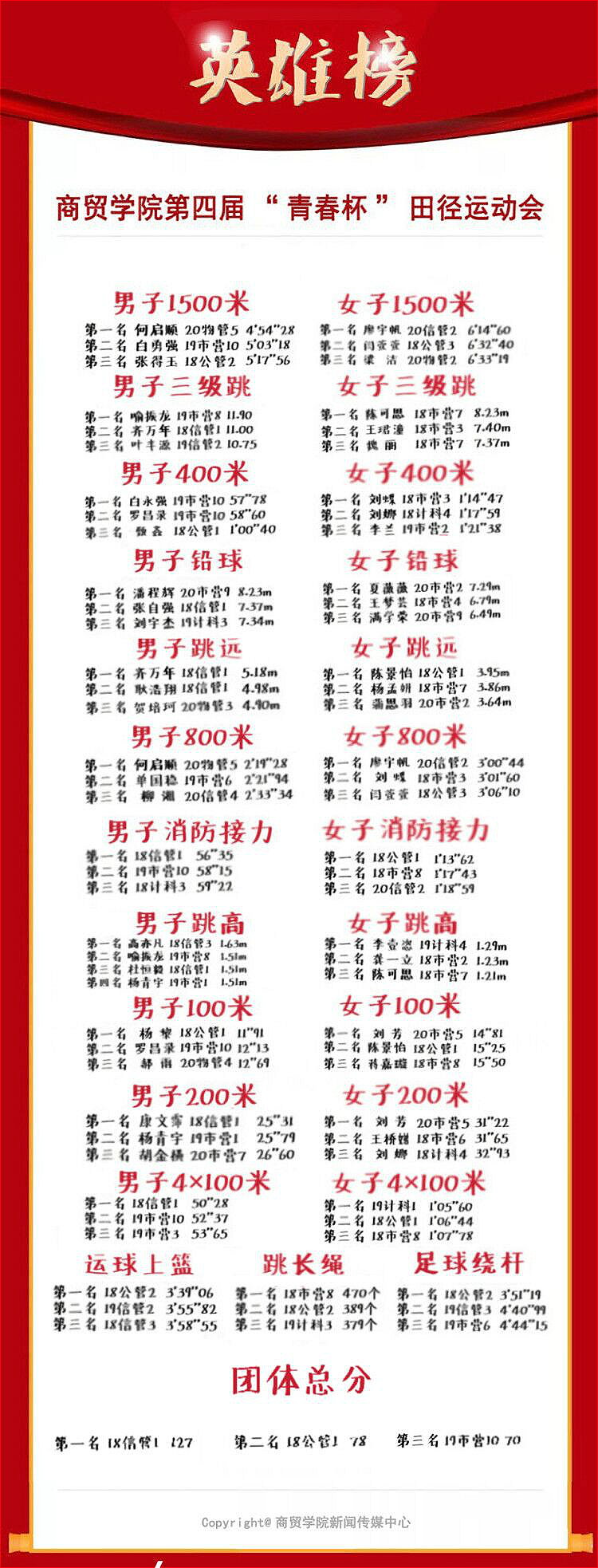 第四届“青春杯”田径运动会学生具体获奖情况如下: