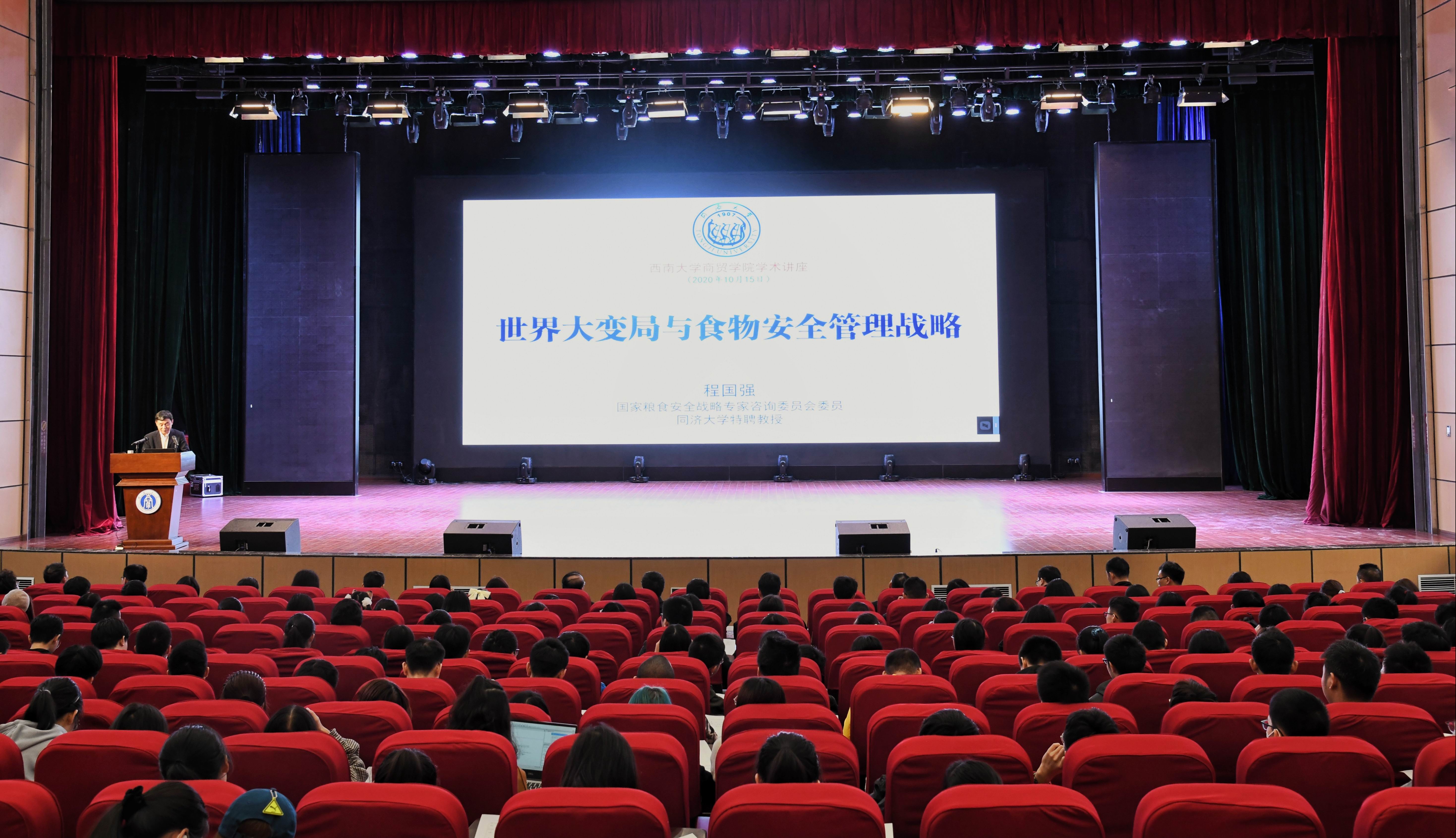 应必赢优惠y272net副院长(主持工作)李晓阳教授邀请,同济大学程国强教授于10月15日来访必赢优惠y272net并在学生活动中心为全院师生作了题为《世界大变局与食物安全管理战略》的学术讲座,学院党政领导、部分教师及600余名学生参加讲座,学院党委书记周国安主持讲座。