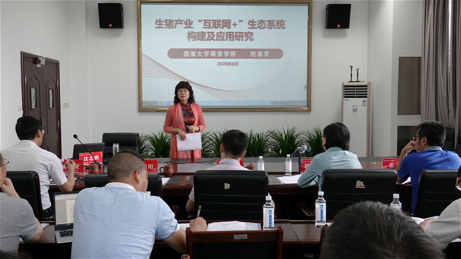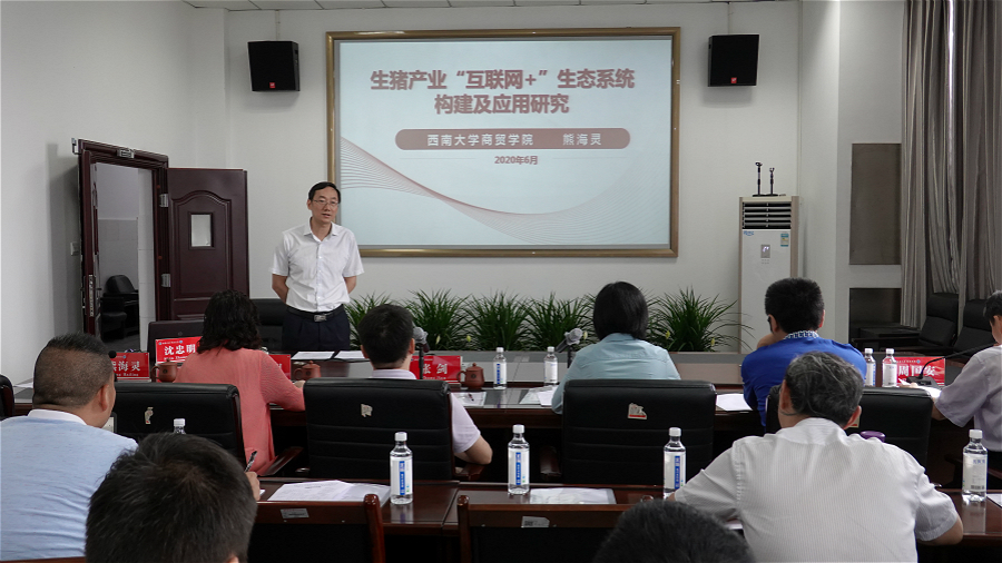 由西南大学荣昌校区党工委书记、必赢优惠y272net熊海灵教授主持的2020年度基本科研业务费专项创新团队项目“生猪产业‘互联网+’生态系统构建及应用研究”(批准号SWU2009107)开题报告会于6月28日上午在必赢优惠y272net8401会议室举行。出席开题报告会的领导和专家有:重庆西信天元数据资讯有限公司张剑董事长;重庆崇锐科技发展有限公司张扬总经理;荣昌区国家生猪大数据中心钟绍智主任;学院党委书记周国安副教授;学院副院长(主持工作)李晓阳教授。同时参加会议的还有来自动物科学学院、必赢优惠y272net等共十五位项目组成员。