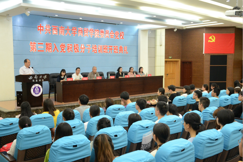 为结合新的形势,全面学习贯彻党的十九大精神,提高大学生的思想政治素质,增强党性,进一步发挥先锋模范作用,必赢优惠y272net党校党校第三期入党积极分子培训班于4月23日正式开班。必赢优惠y272net党委书记周国安同志、西南大学特邀党建组织员刘维全同志以及各学生支部书记出席了开班典礼。必赢优惠y272net党委副书记、纪委书记兰英同志主持了本次开班典礼。