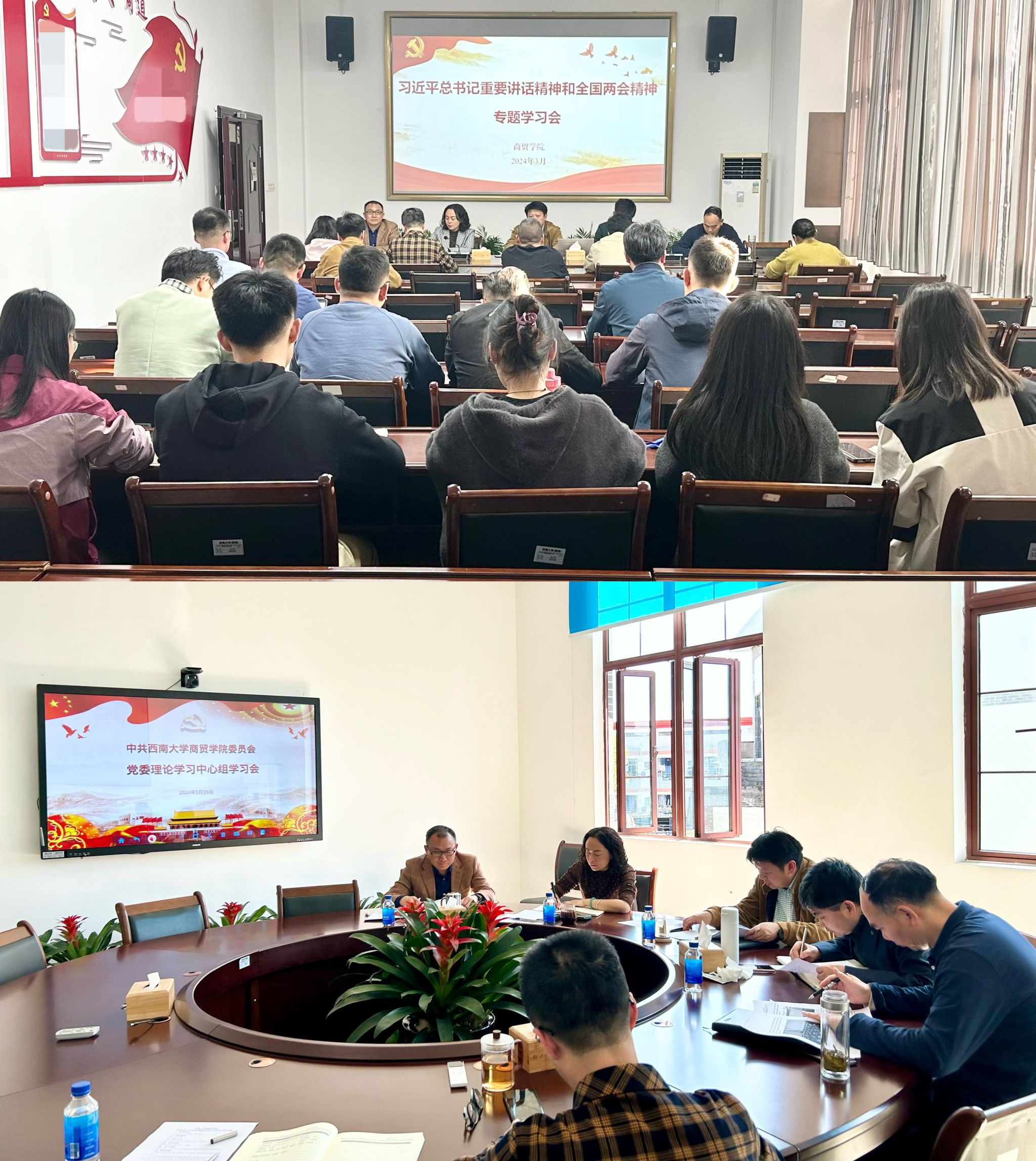 3月25日,学院组织召开党委理论学习中心组专题学习会和教职工政治理论学习会,学院党委书记王熹领学,与会人员围绕学习内容,结合工作实际,交流如何以实际行动推动学院发展、助力学生成长。3月20-29日,各党、团支部组织召开主题党、团日活动,同学们集中学习,自由研讨,积极探讨当下大学生如何发挥青春力量。