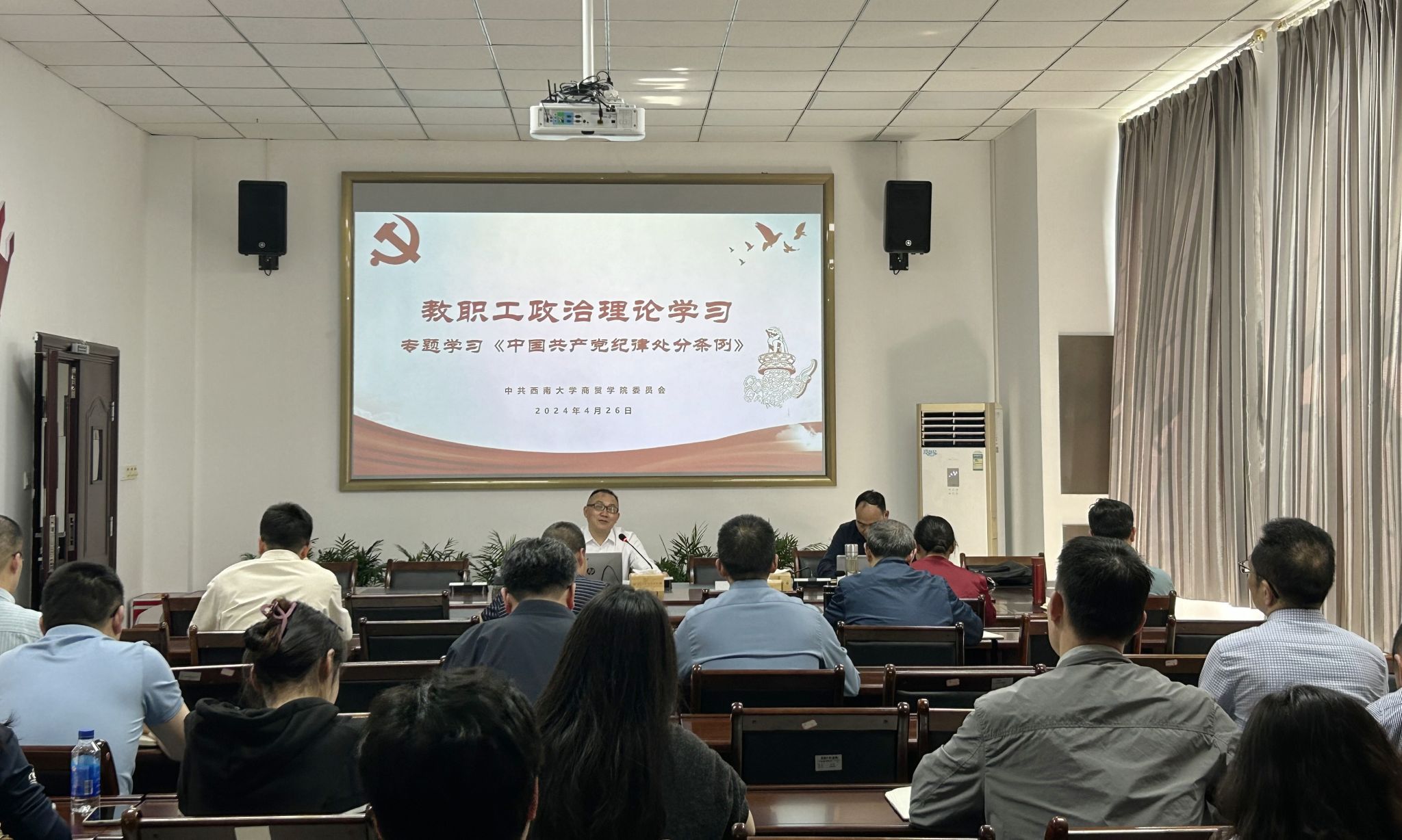 4月26日,必赢优惠y272net开展教职工政治理论学习,学院副院长韩毅组织全院教职工逐章逐条学习《条例》的总则部分。通过本次专题学习,真正让学习党纪的过程成为增强纪律意识、提高党性修养的过程,推动《条例》入脑入心。