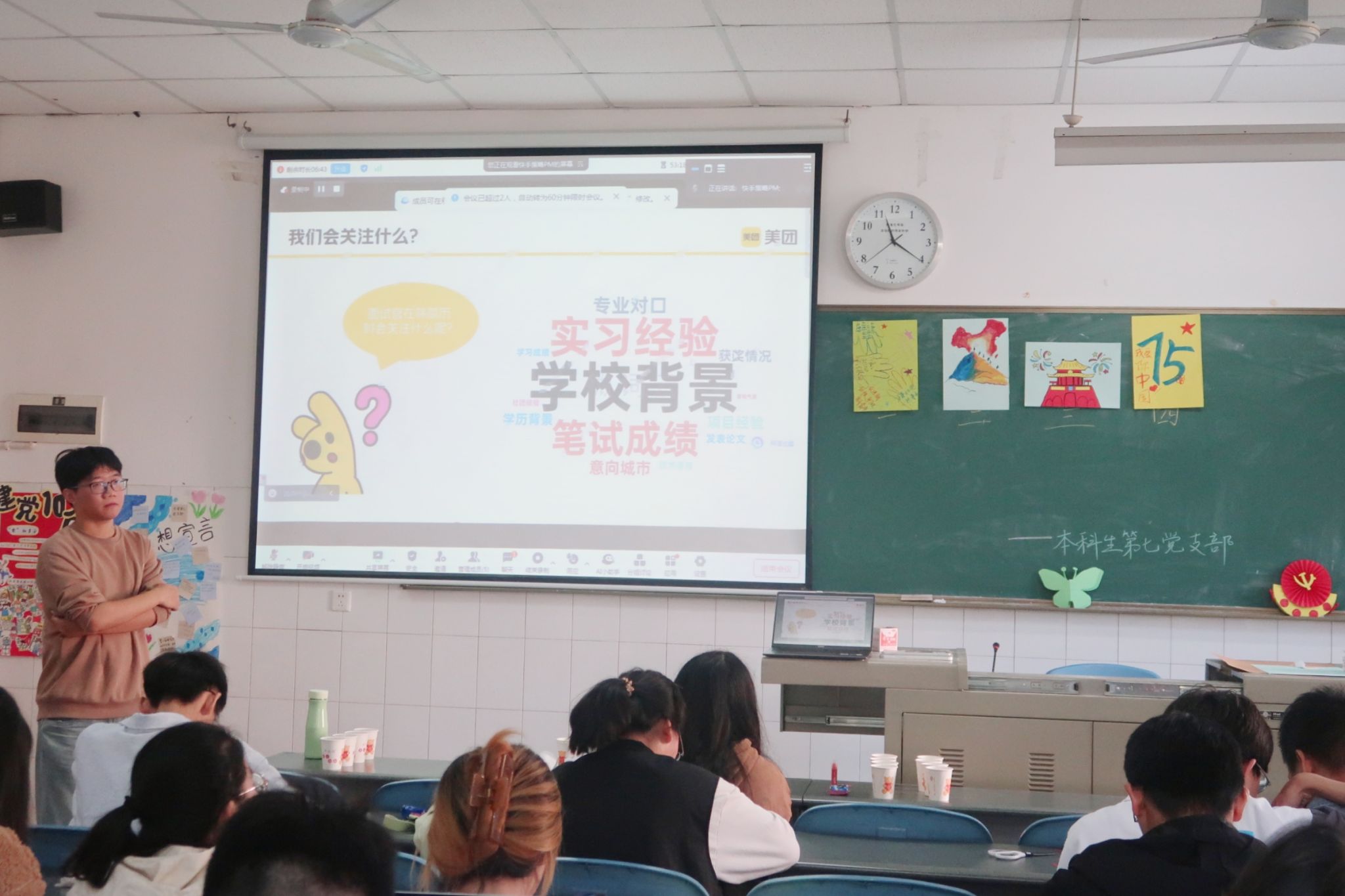 在“榜样力量:筑梦未来,共促成长进步”环节,通过对保研、就业多角度、多维度的深入分析,发挥党员同志的传帮带作用。支部1名2020级优秀毕业党员、2名2021级保研党员向与会人员分享了大学期间的成长经历、保研过程中的经验总结,还邀请了1名短视频“快手”HR分享职场人的成长心理路程,为大家提供了宝贵的参考和借鉴。随后的自由问答交流环节更是将活动气氛推向高潮。