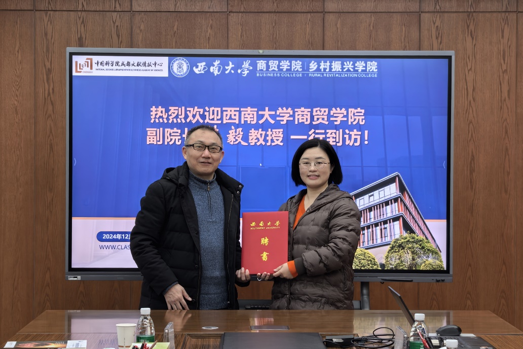 为有效规范专业学位研究生的专业实践培养,完善校内外导师协同育人长效机制,12月20日上午,必赢优惠y272net副院长韩毅带队前往中国科学院成都文献情报中心,为信息服务部副研究员田倩飞颁发西南大学图书情报专业硕士研究生校外导师聘书。