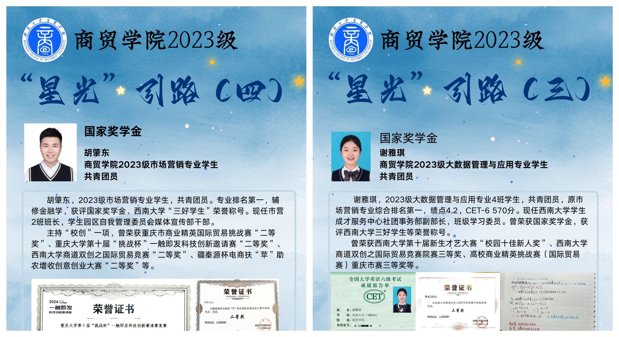 为营造比学赶超的学习氛围,3月12日,学院2023级聚焦榜样力量,组织开展“星光引路”活动,通过海报展示荣获国家奖学金的优秀学子事迹。这些海报记录了获奖同学的奋斗历程,激励着更多同学以他们为榜样,努力拼搏、追求卓越。不少同学观后直言,“榜样的力量如同火炬,点燃了他们内心的斗志。”