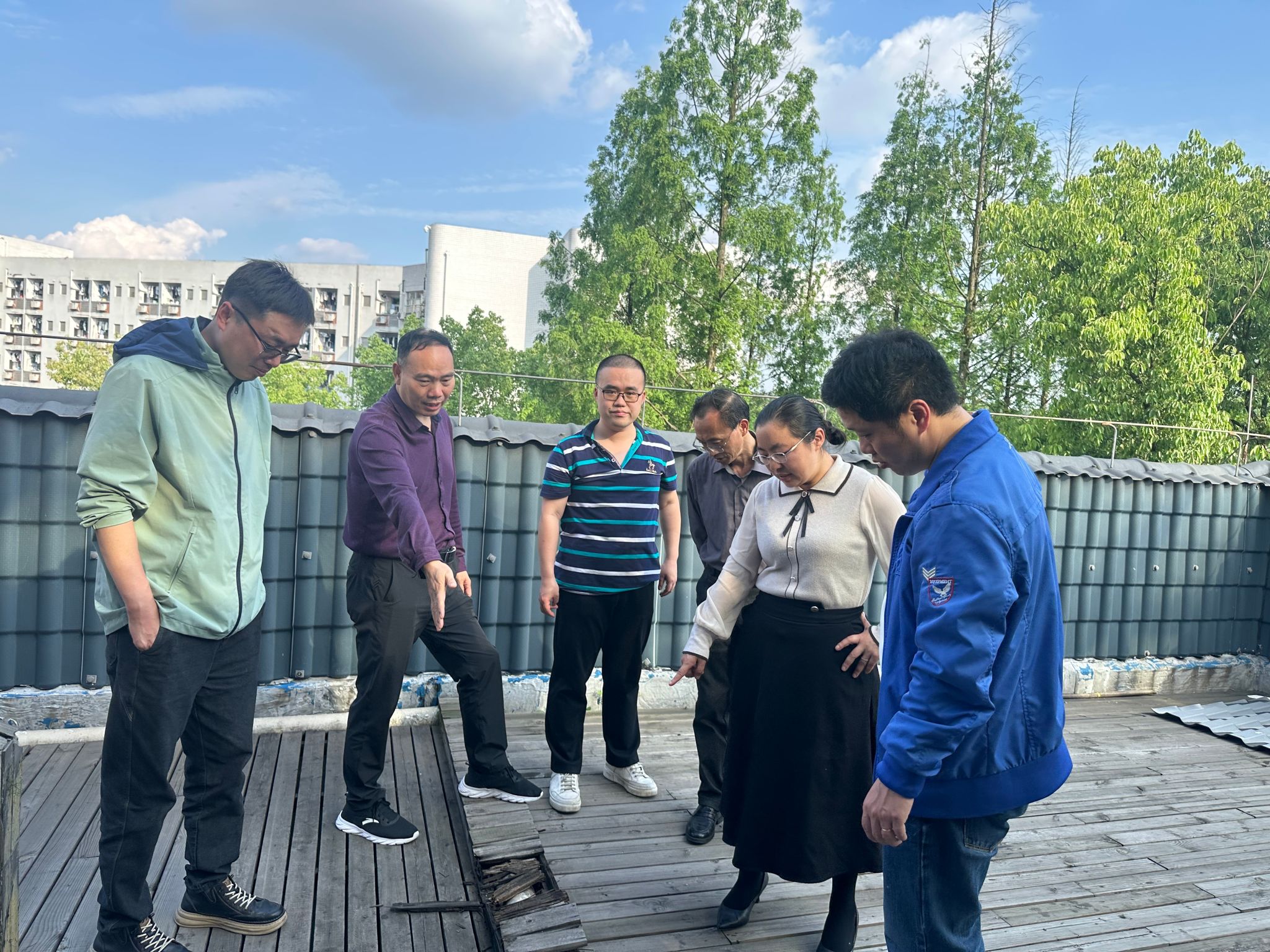 检查小组一行还查看了九教天台漏水情况,对于部分地板破损、水管外露、排污口易堵等问题,现场作出整改指示。