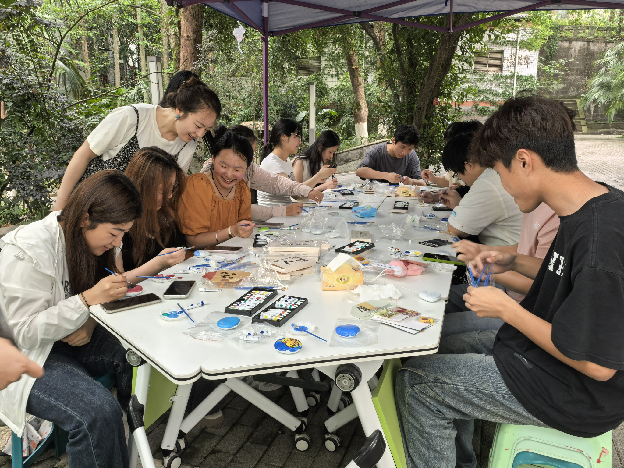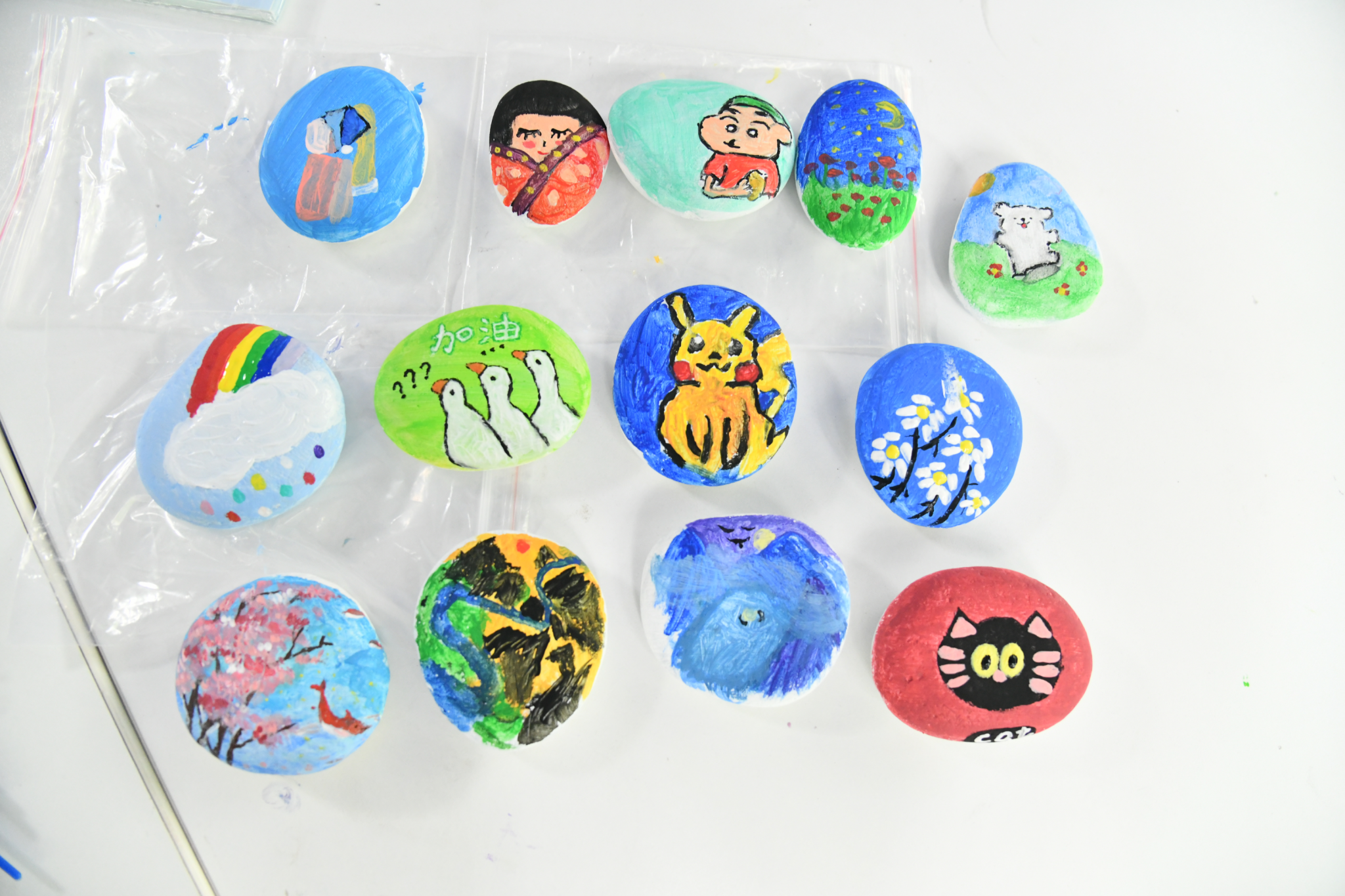 走进“创意魔法屋:石头画”的奇妙空间,一颗颗平凡的鹅卵石在学生们的手中,在五彩斑斓的丙烯颜料的装点下,摇身一变成为独一无二的艺术作品。创作的过程,既是压力的释放,更是创造力的尽情绽放。而这些承载着创作者独特情感的画作,还能进一步制作成精美的饰品或摆件,成为永恒的美好纪念。