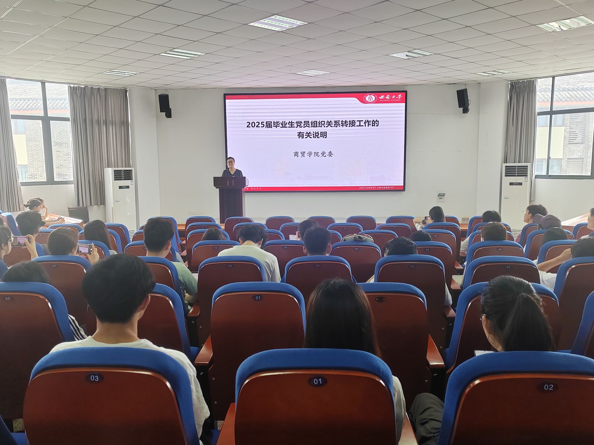 5月22日,组织员刘莉莉老师向全体毕业生党员详细介绍组织关系转接工作。她从组织关系转接的流程、注意事项、常见问题等方面入手,为毕业生党员进行了详实讲解,确保毕业生党员能够顺利完成党组织关系转接工作。