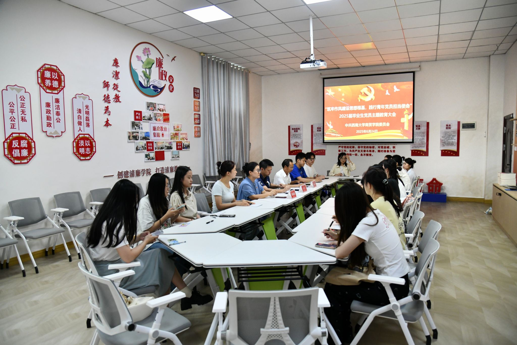 6月24日,学院党委在8101党建活动室召开毕业生党员教育大会。学院党委书记王熹,党委副书记、纪委书记文武,组织员刘莉莉出席会议,2025届毕业生党员参会。全体毕业生党员重温入党誓词,牢记入党初心。随后,在场老师为毕业生党员赠送书籍《习近平与大学生朋友们》,鼓励党员加强理论学习,做到知行合一,致知于行。接着,王熹为毕业生党员讲授《锚定初心使命,践行中央八项规定精神,勇做新时代奋斗者》主题党课。党课围绕新时代党员的责任与担当展开,聚焦深刻领会中央八项规定精神的核心要义与重大意义,指明毕业生党员贯彻落实中央八项规定精神的实践路径。王熹强调,作为新时代的共产党员,必须始终牢记初心使命,保持与人民群众的血肉联系。他指出,中央八项规定精神是每一名党员都应当遵守的要求。全面从严治党是党永葆生机活力的根本保证。党员同志们要以实际行动赢得群众信任,树立良好形象。现场气氛热烈,互动环节中,王熹与毕业生党员深入交流,了解他们的职业规划和发展方向,勉励大家在新的人生阶段继续发挥先锋模范作用。
