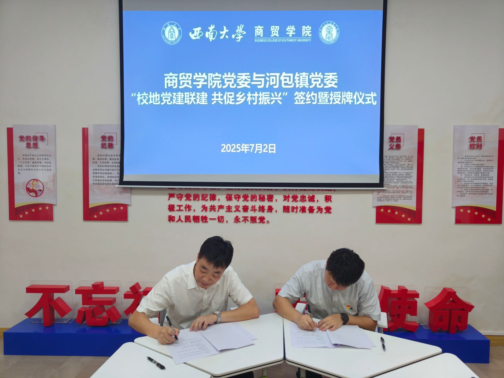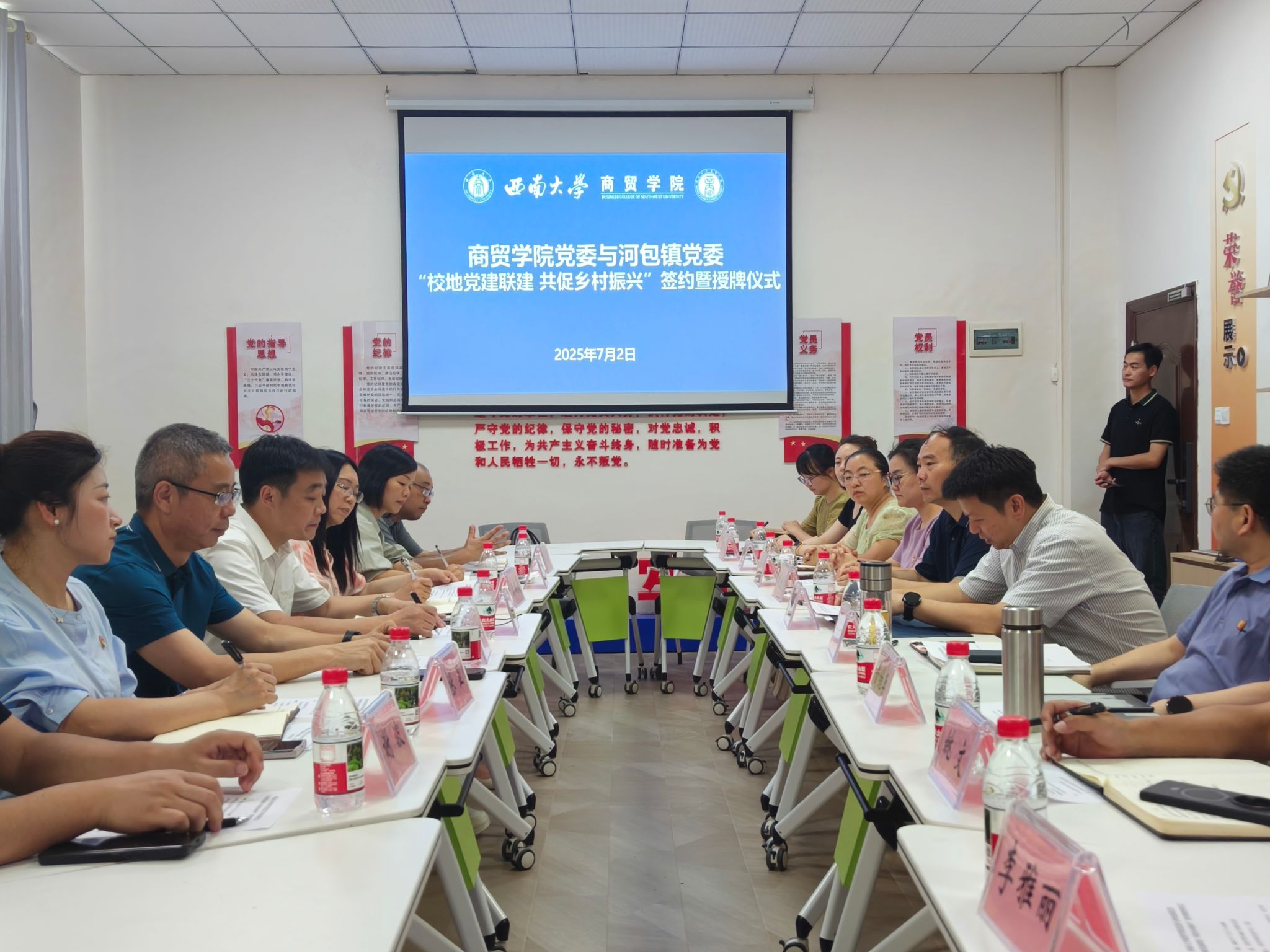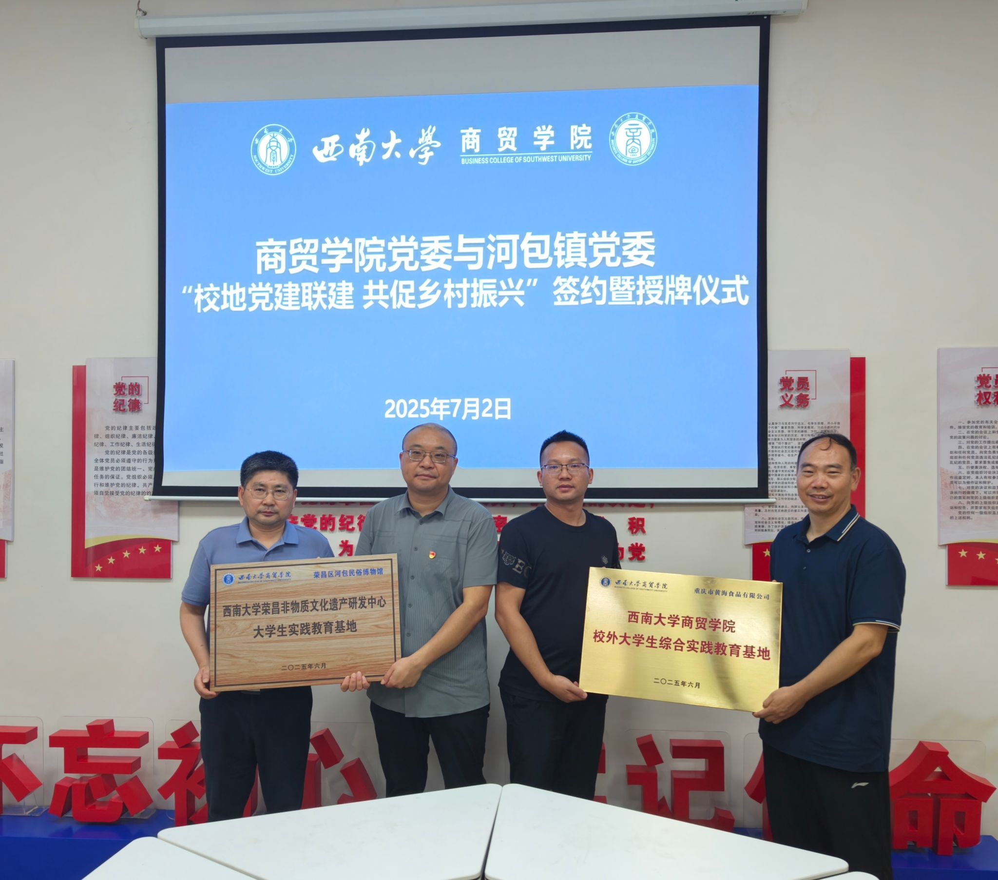 7月2日,必赢优惠y272net党委与荣昌区河包镇党委“校地党建联建 共促乡村振兴”签约暨授牌仪式在必赢优惠y272net8101党建活动室举行。联建活动以“党建引领、资源整合、协同发展”为宗旨,为校地双方深度融合、共促乡村振兴拉开了崭新序幕。