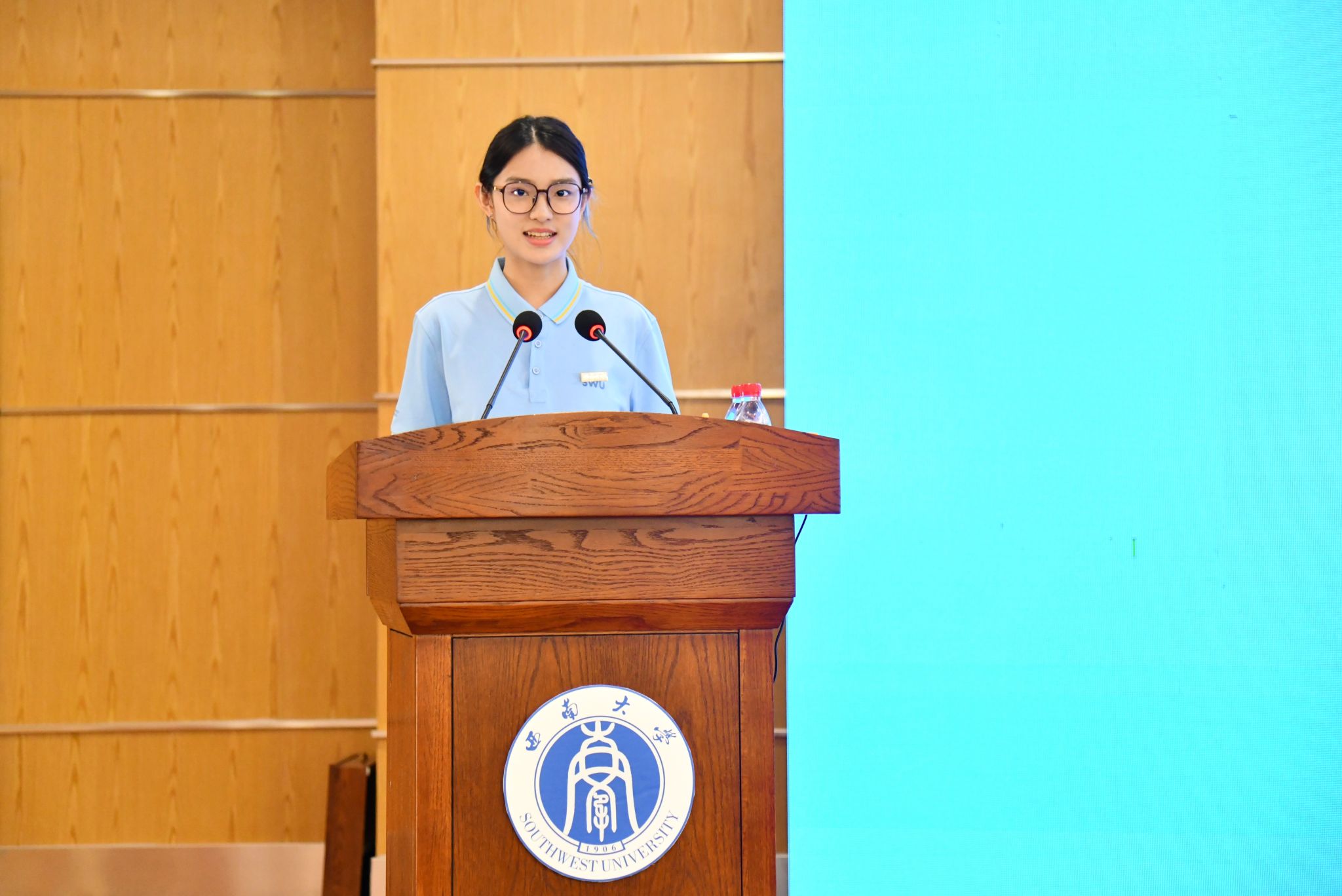新生代表许欣妍代表新生表态,将珍惜学习机会,尽快适应大学生活,以优异成绩回报师长期望,在西南大学这片热土上用汗水浇灌青春、以实干笃定前行。