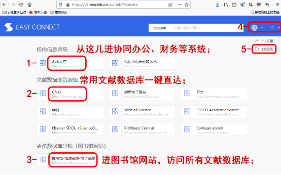 三、点击页面上的导航链接即可以访问相应资源。例如:通过点击“办事大厅”可以访问相应系统(包括协同办公系统、教务系统等),通过“文献数据库”可以访问校内及校外电子资源。