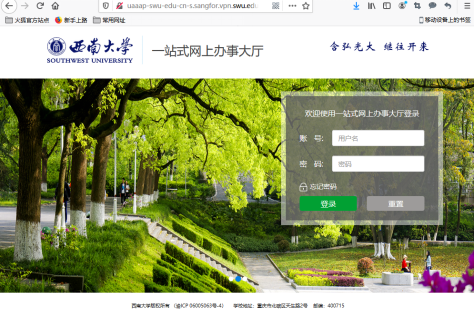 一、在浏览器输入网址:https://spvpn.swu.edu.cn,进入学校一站式网上办事大厅登陆界面: