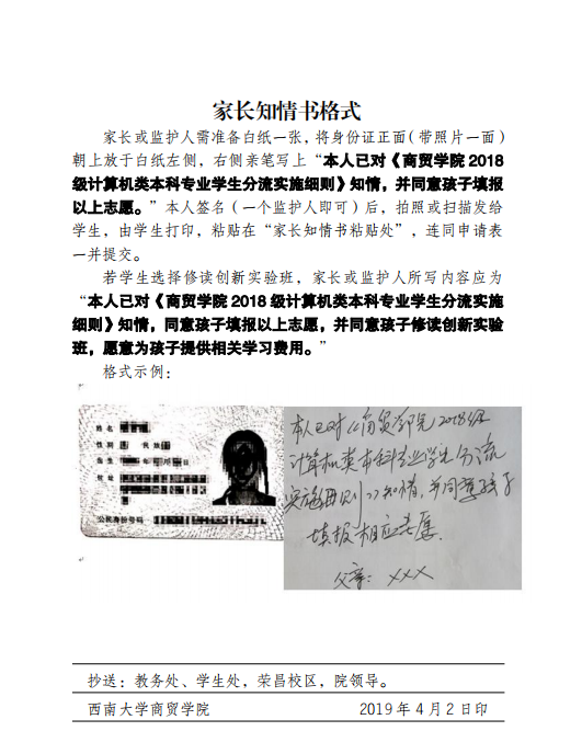 家长或监护人需准备白纸一张,将身份证正面(带照片一面)朝上放于白纸左侧,右侧亲笔写上“本人已对《必赢优惠y272net2018级计算机类本科专业学生分流实施细则》知情,并同意孩子填报以上志愿。”本人签名(一个监护人即可)后,拍照或扫描发给学生,由学生打印,粘贴在“家长知情书粘贴处”,连同申请表一并提交。